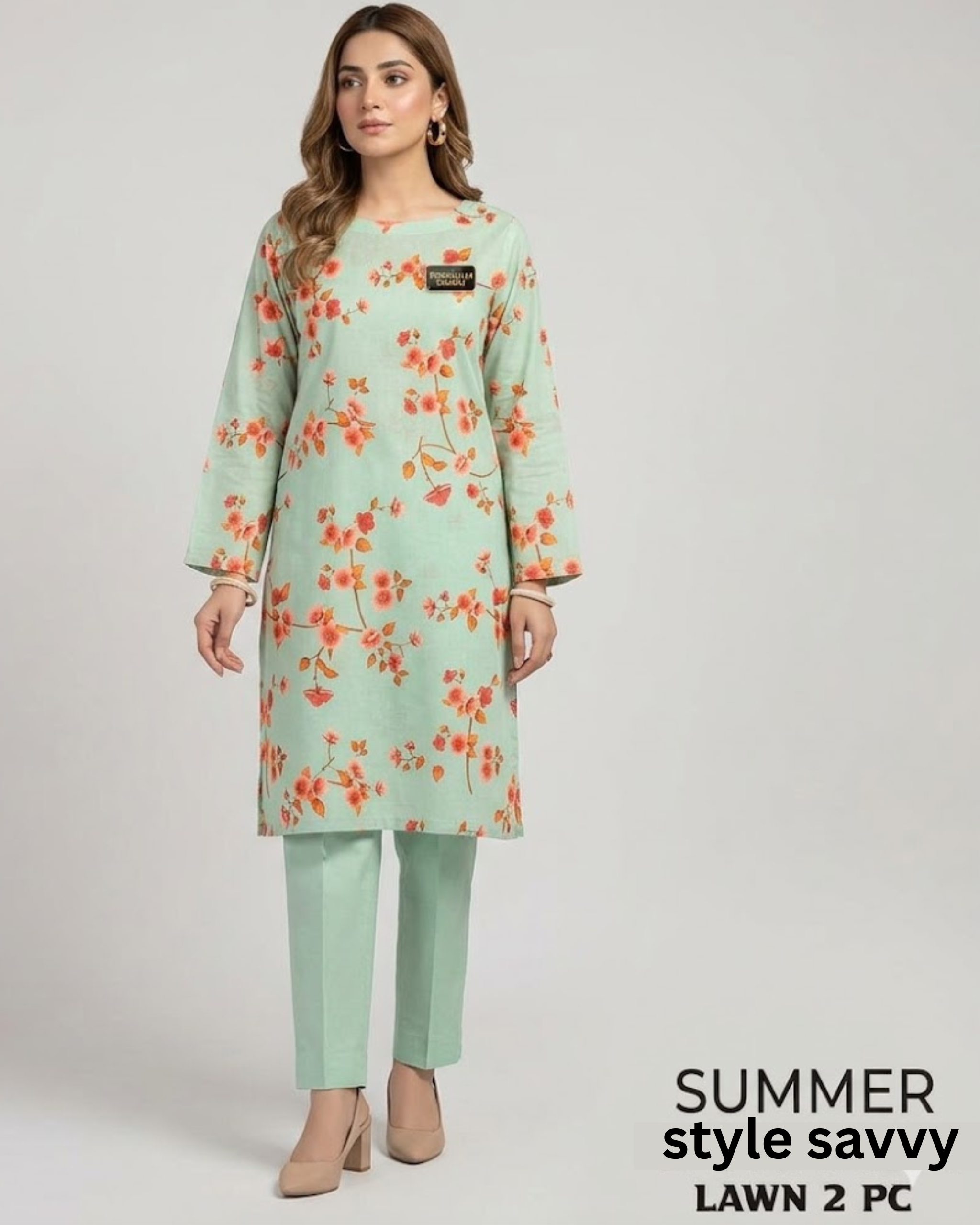 Top (Kameez): A straight-cut kurta in a soothing mint green base. The fabric features a delicate all-over botanical print of branching sprigs and blossoming clusters in soft coral and orange tones. It is designed with a modest round neckline and features a signature gold-toned branding badge on the left chest.